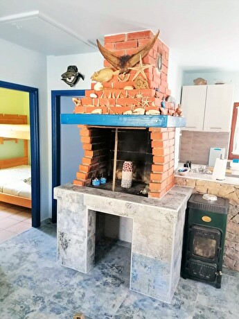 Barbecue and fire place inside that can also be used for cooking. Outdoor shower heated by the sun.